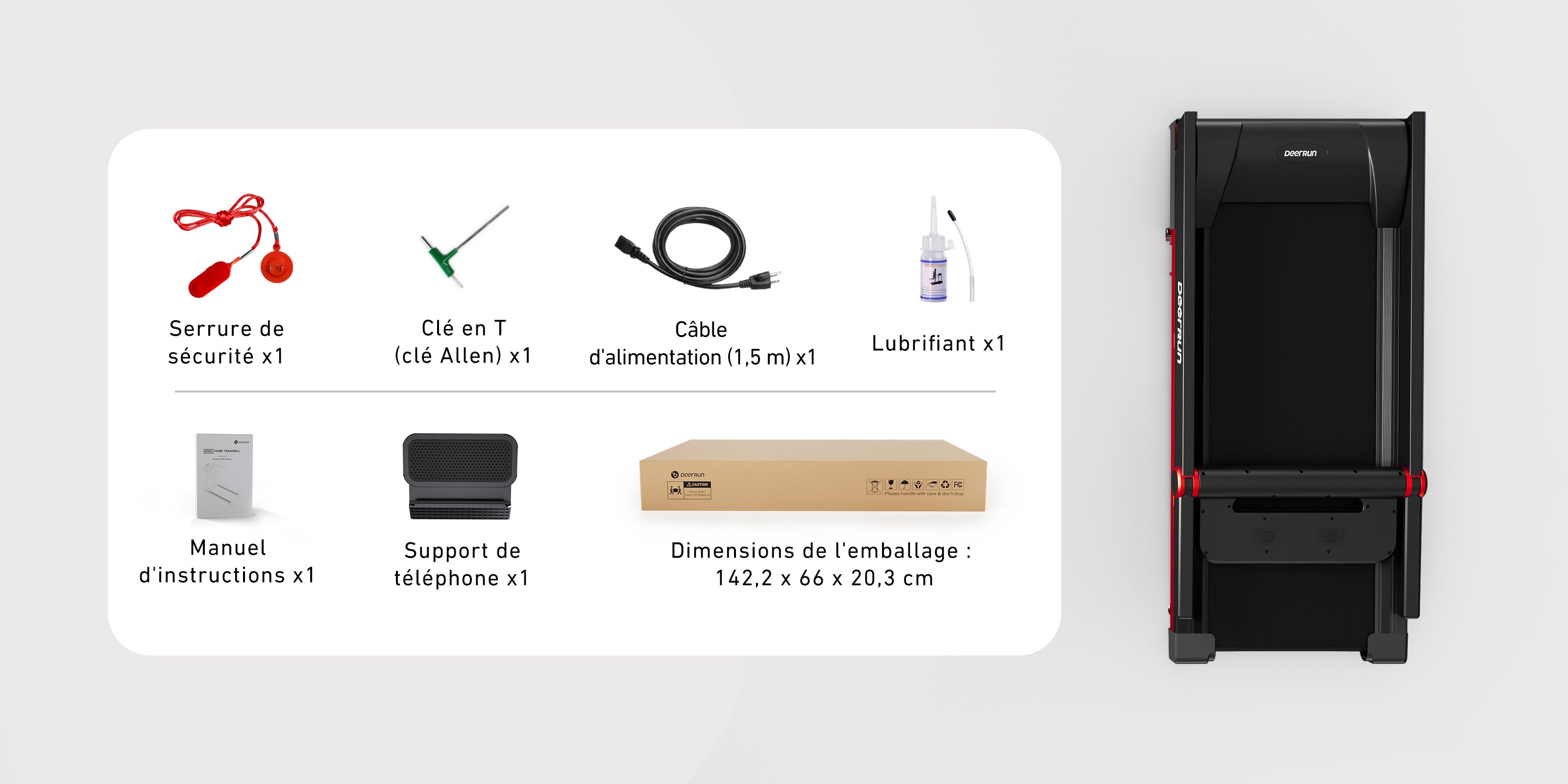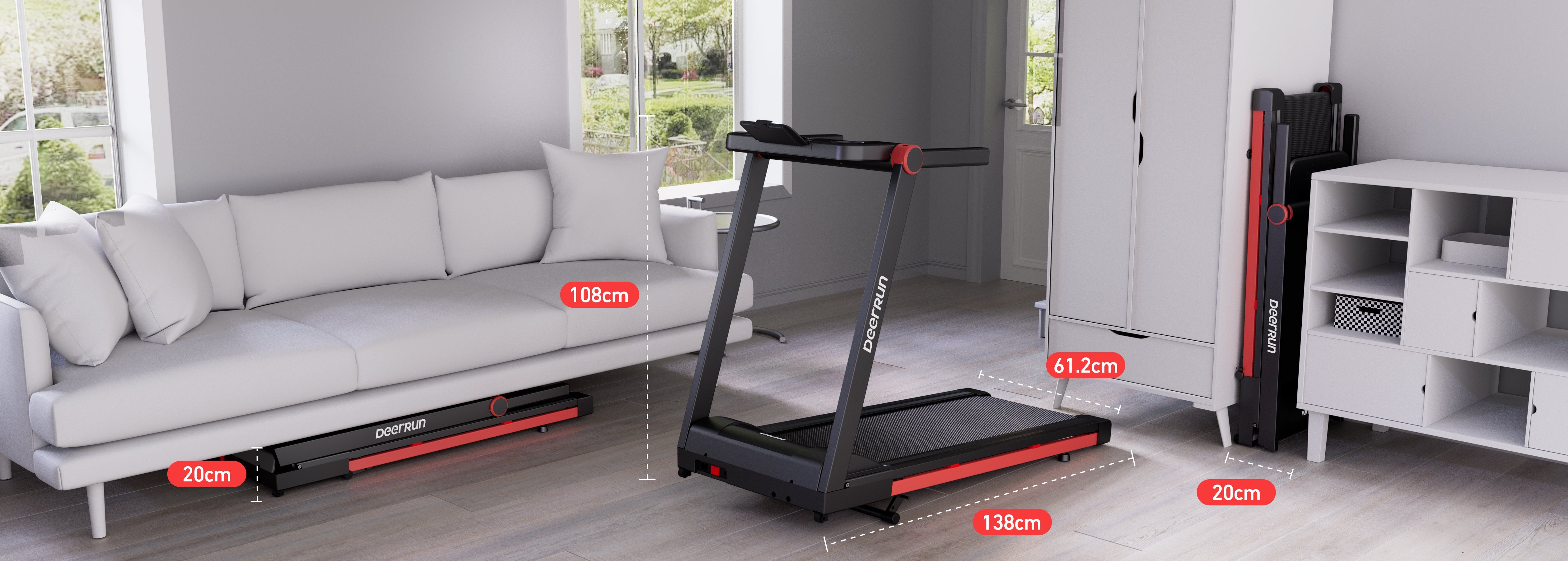 Le tapis de course peut être installé verticalement ou rangé sous le canapé, occupant ainsi un minimum d'espace. Sa surface de course extra-large de 138 cm x 61,2 cm vous offre confort et liberté de mouvement pendant votre entraînement ; une fois plié, il ne prend que 0,1 m² d'espace au sol.