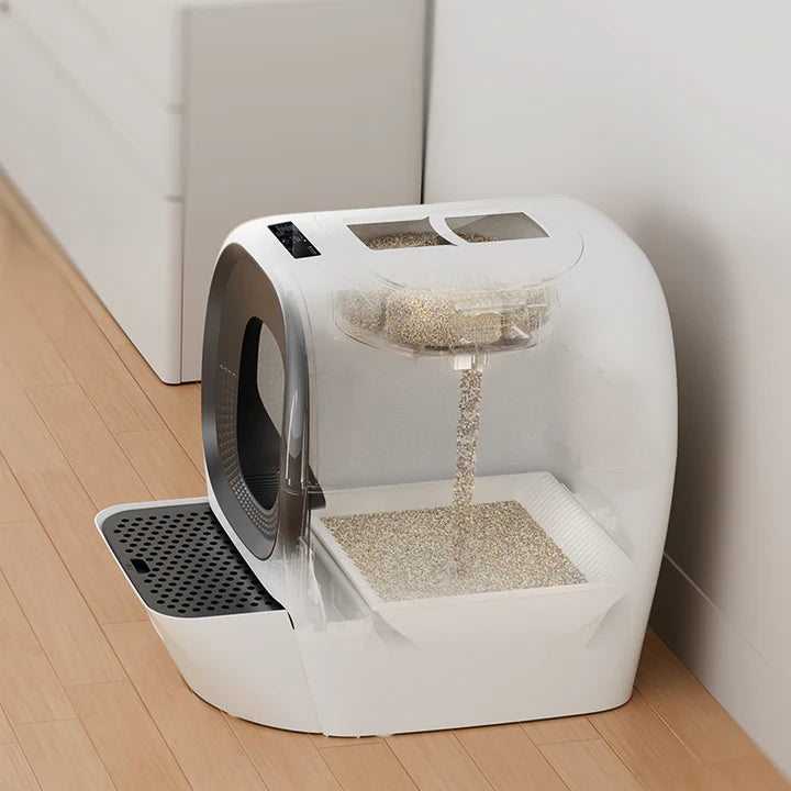 Grâce à son système intelligent, la litière se recharge toute seule avec de la litière fraîche pendant 14 jours. Plus jamais de corvée de litière : votre chat bénéficie d'un bac toujours propre, et vous, d'une sérénité au quotidien.