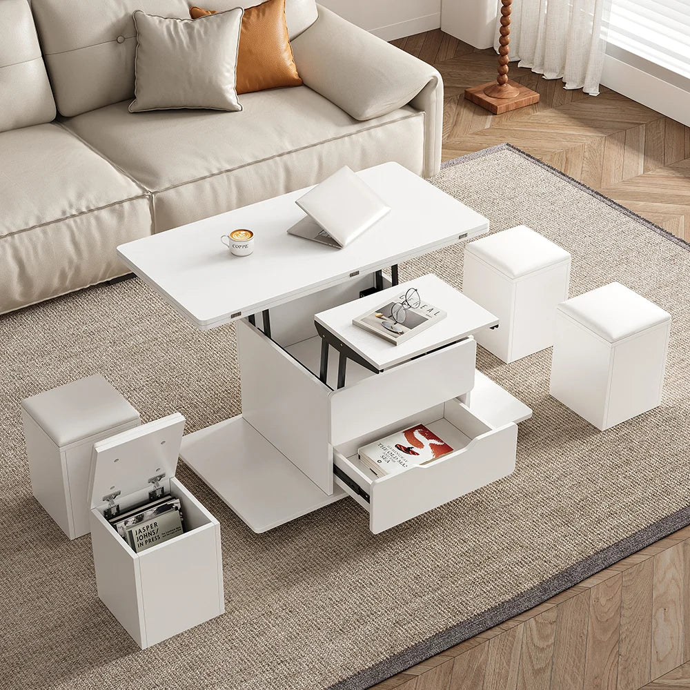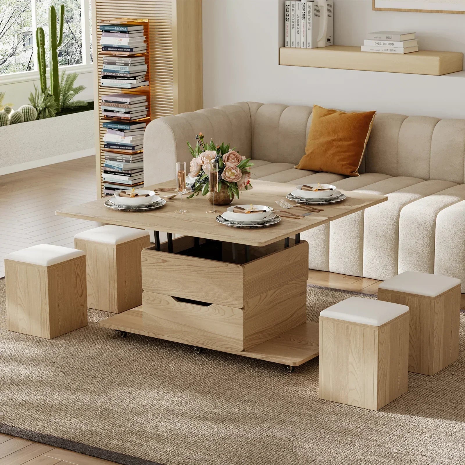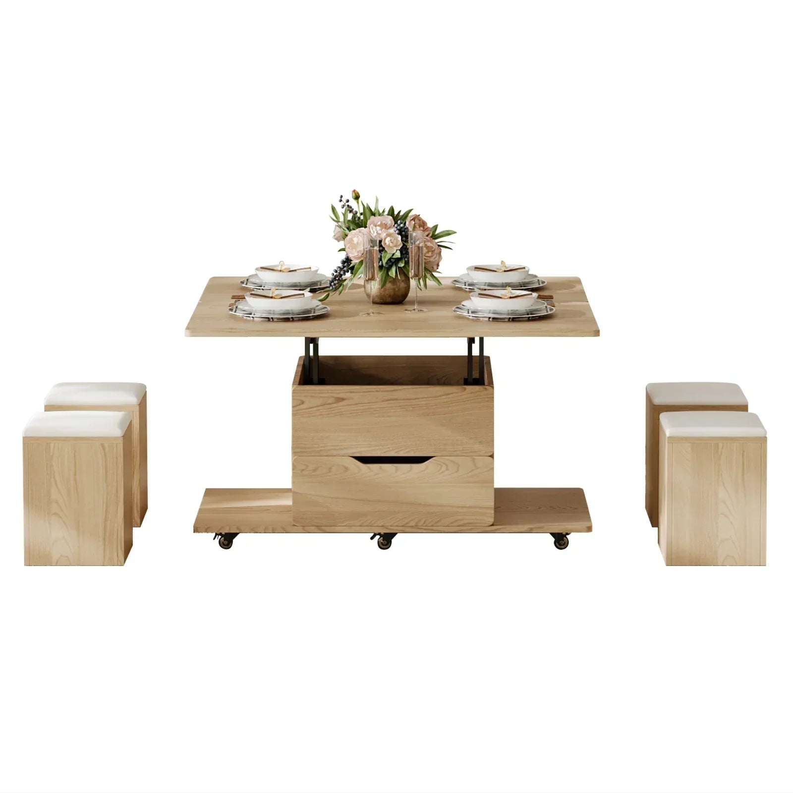 Cette table basse multifonctionnelle est conçue pour maximiser l'espace sans compromettre le style. Avec son plateau relevable, ses quatre tabourets pliables avec rangement intégré et ses roulettes pivotantes verrouillables, elle s'adapte à tous vos besoins : repas, travail ou détente. Son design naturel et épuré s'intègre parfaitement dans tout intérieur moderne.